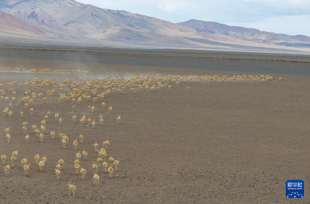 一群藏羚羊因感覺到危險而開始奔跑(無人機照片,6月13日攝)。新華社記者 薑帆 攝