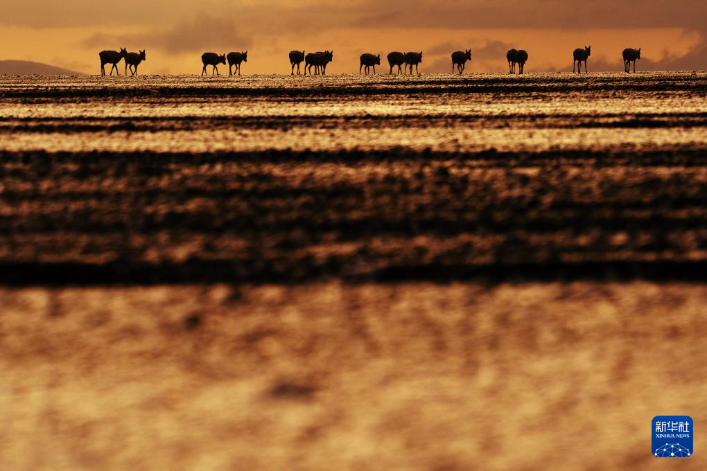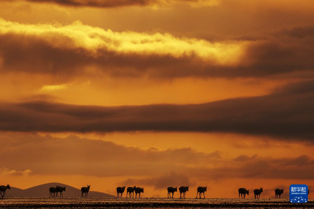 6月14日,在西藏那曲市尼瑪縣境內(nei) 的羌塘國家級自然保護區“無人區”深處,一群藏羚羊迎著朝陽,行進在遷徙路上。新華社記者 費茂華 攝