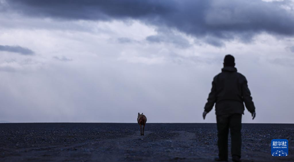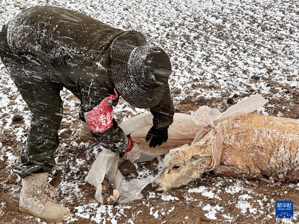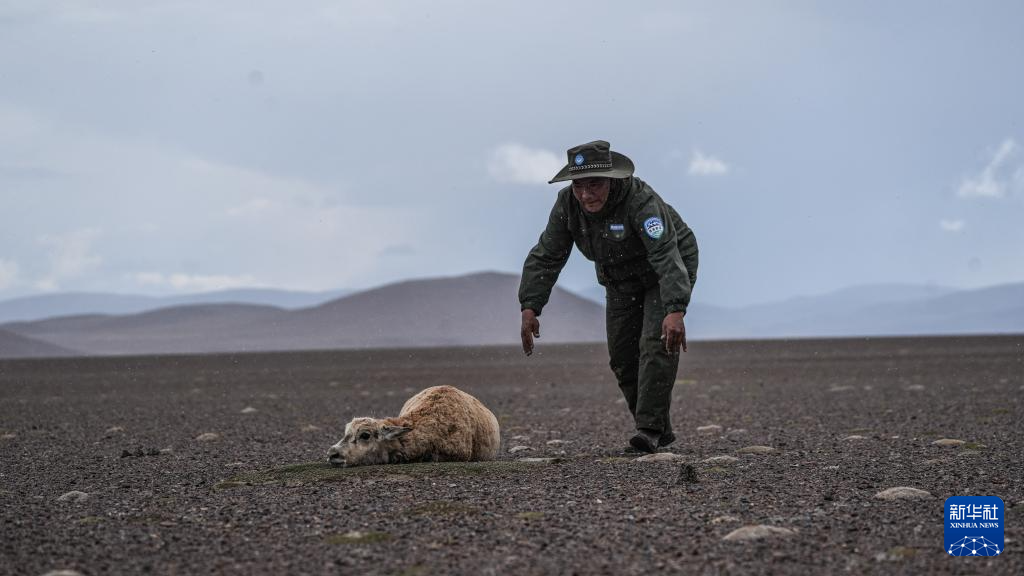 羌塘國家級自然保護區的野保員上前查看受傷(shang) 的母藏羚羊(6月14日攝)。新華社發(旦增攝)