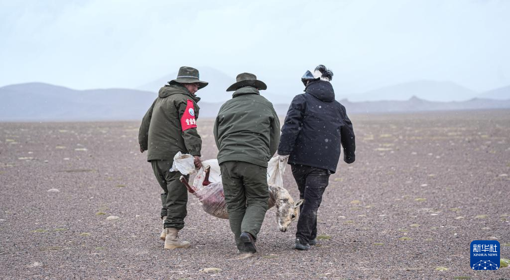 羌塘國家級自然保護區的野保員把受傷(shang) 的母藏羚羊抬到臨(lin) 時營地附近(6月14日攝)。新華社發(旦增攝)