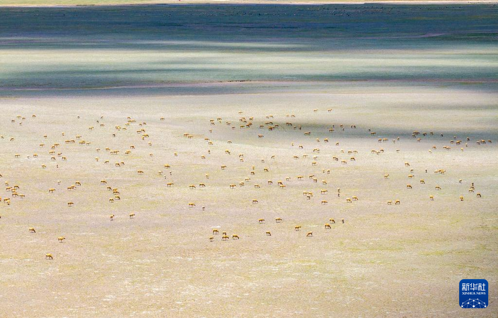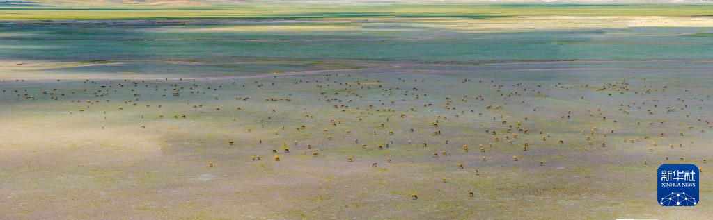 藏羚羊在魯確塘草原集結(無人機照片,6月8日攝)。新華社記者 薑帆 攝