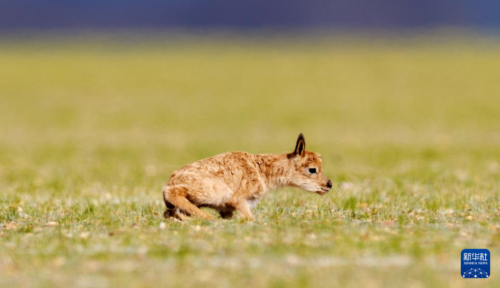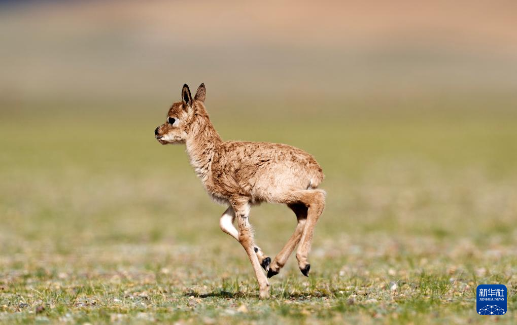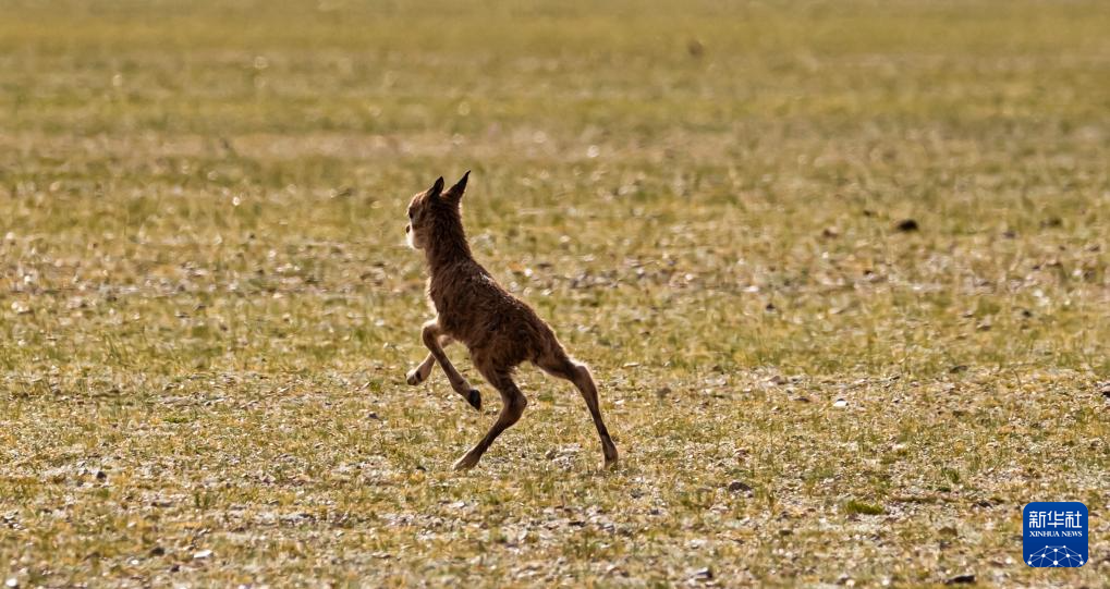 6月17日,在魯確塘草原,一隻剛出生不久的小藏羚羊在草地上奔跑。新華社記者 費茂華 攝