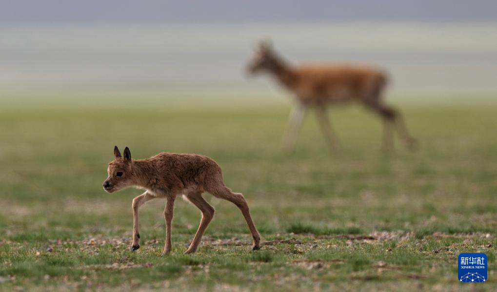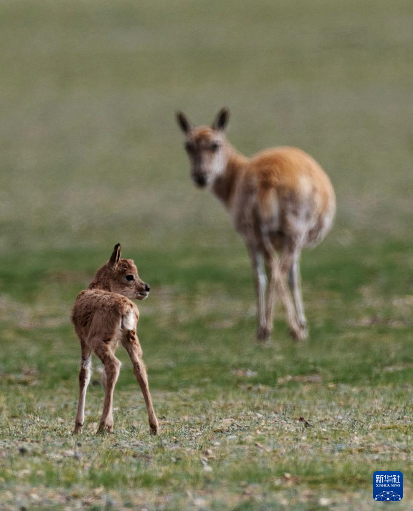 6月17日,在魯確塘草原,一隻剛出生不久的小藏羚羊跟著母藏羚羊在草原上漫步。新華社記者 費茂華 攝