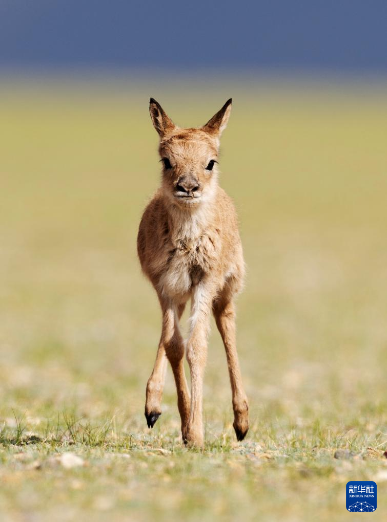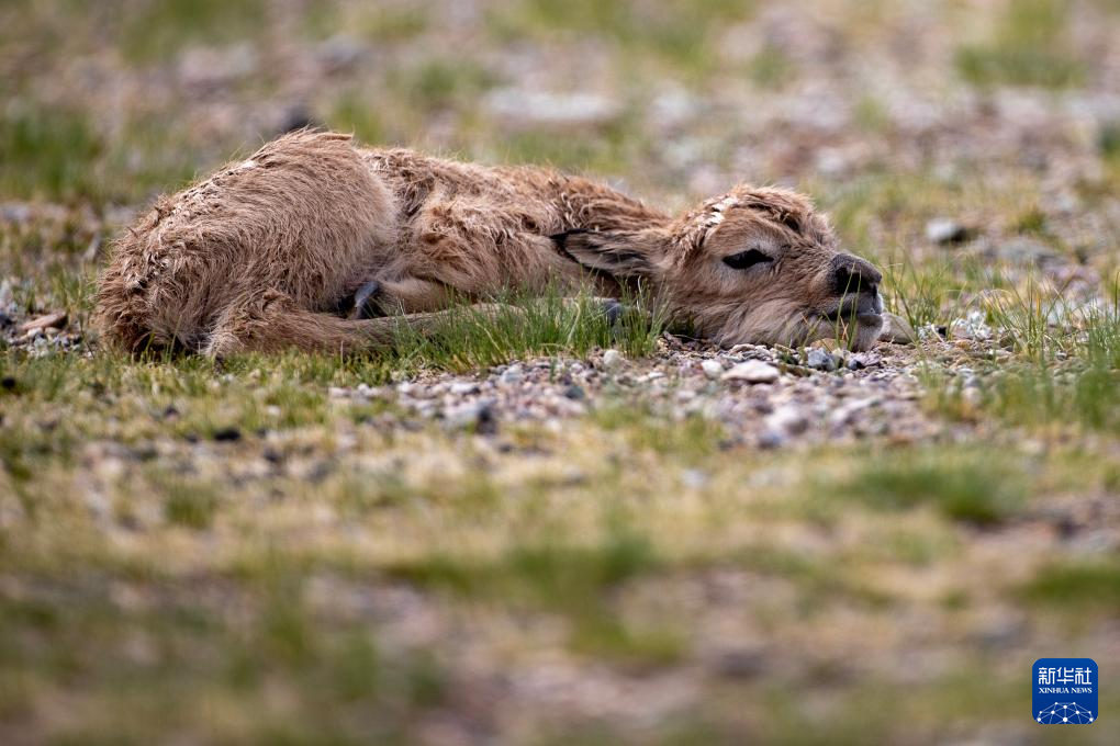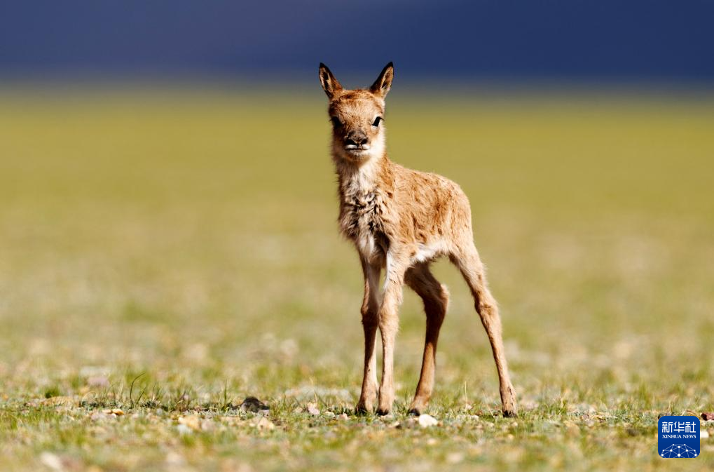 魯確塘草原上臍帶尚未脫落的小藏羚羊(6月17日攝)。新華社記者 薑帆 攝