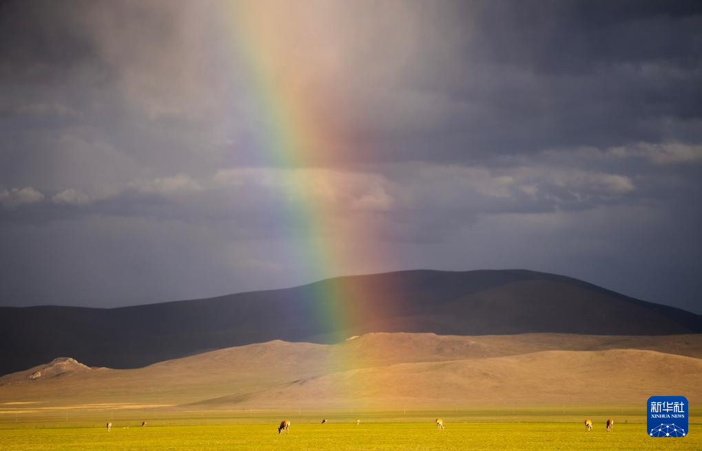 6月16日,彩虹下待產(chan) 的藏羚羊。新華社記者 費茂華 攝