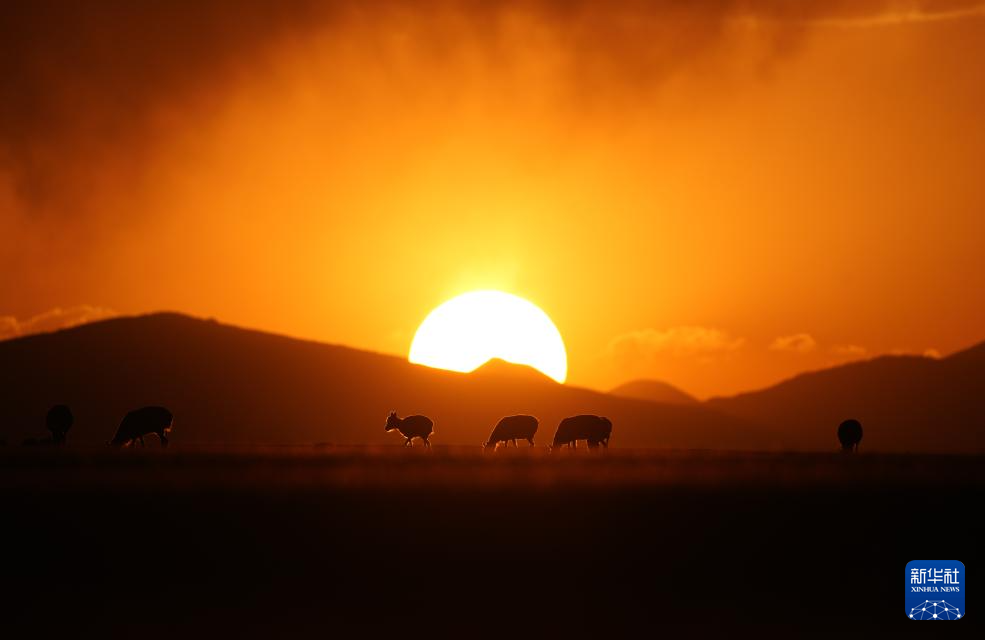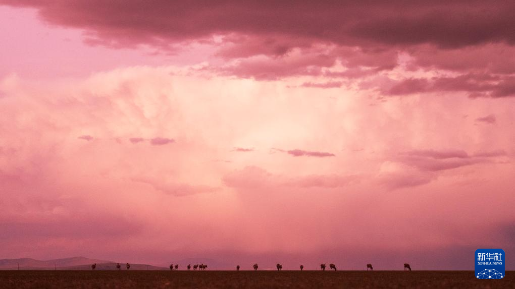晚霞中魯確塘草原上待產(chan) 的藏羚羊(6月16日攝)。新華社記者 費茂華 攝