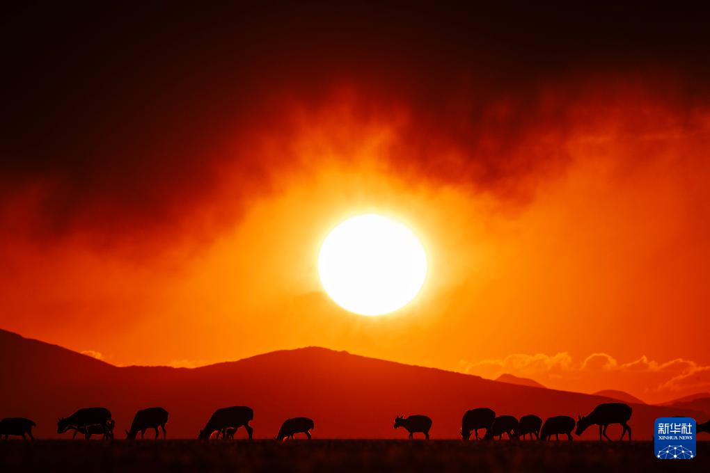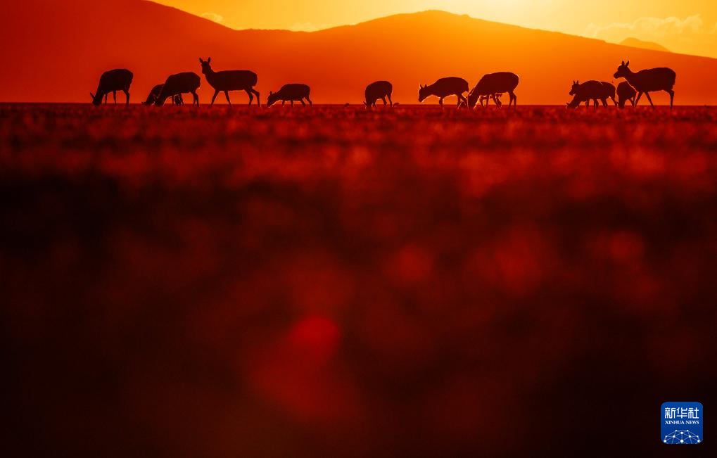 在魯確塘草原上,待產(chan) 的藏羚羊在霞光的包圍中進食(6月16日攝)。新華社記者 費茂華 攝