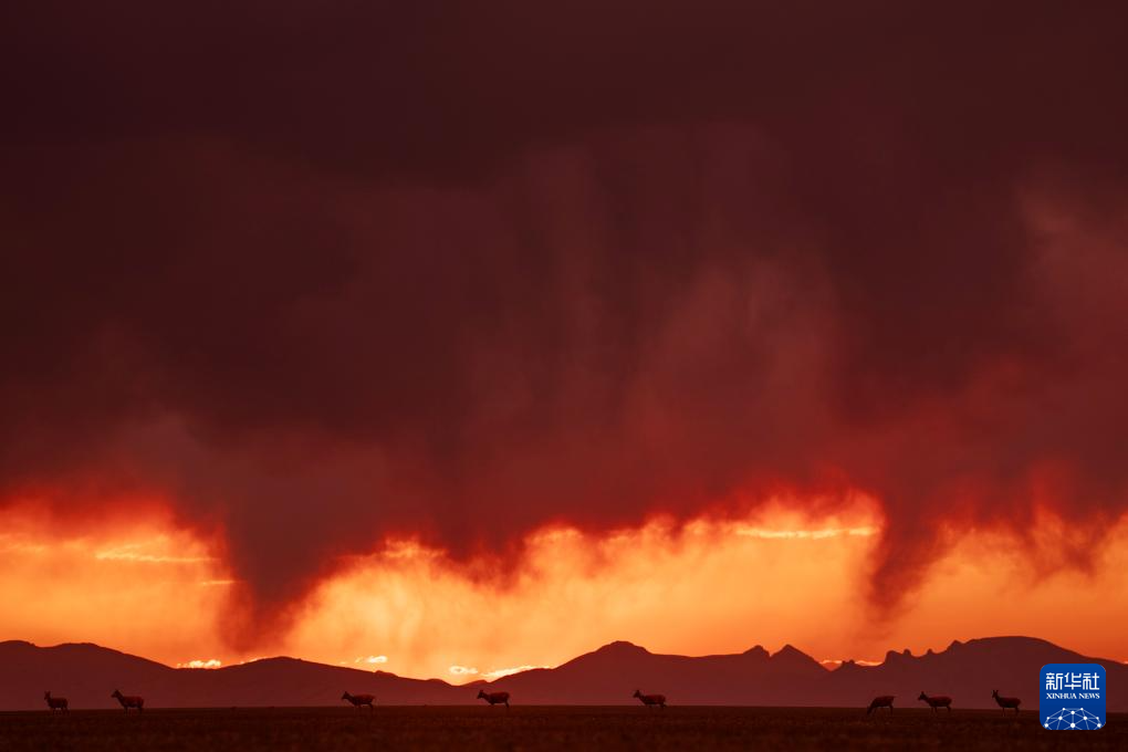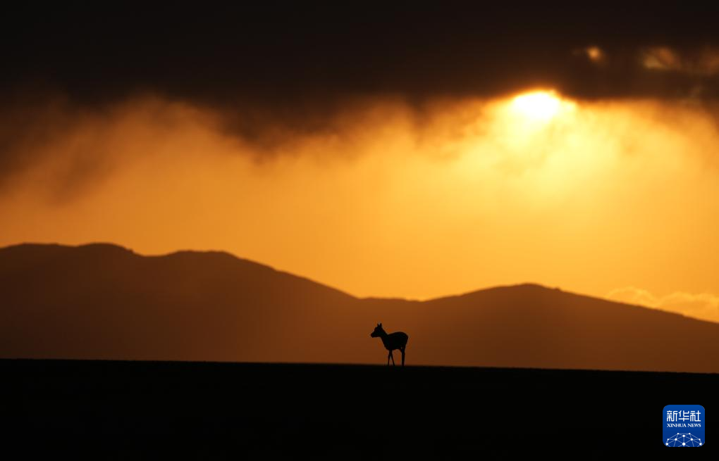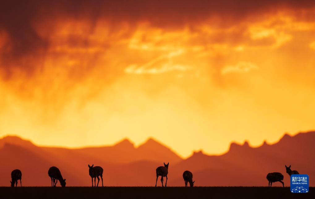 晚霞中待產(chan) 的藏羚羊(6月16日攝)。新華社記者 費茂華 攝