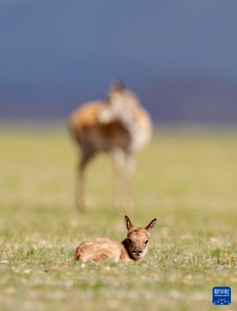 6月17日,在魯確塘草原,出生不久的小藏羚羊趴在草地上休息,一隻母藏羚羊在一旁守護。新華社記者 費茂華 攝