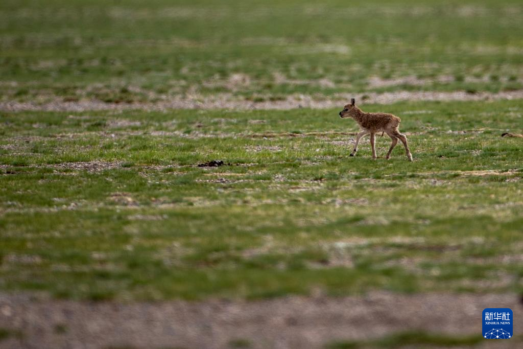 6月17日,在魯確塘草原上,一隻剛出生不久的小藏羚羊跟著羊群奔跑。新華社記者 費茂華 攝