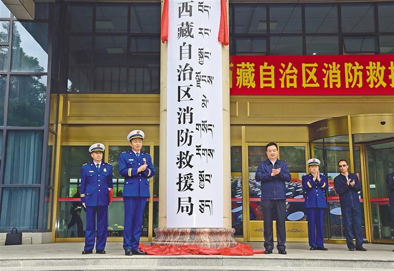 6月18日上午,自治區黨(dang) 委書(shu) 記王君正前往自治區消防救援總隊調研。這是王君正為(wei) 西藏自治區消防救援局揭牌。本報記者 旦增西旦 攝