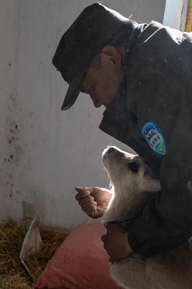 羅布玉傑站的野生動物專(zhuan) 業(ye) 管護隊員在出發巡護前給站裏救護的受傷(shang) 藏原羚喂糌粑(5月7日攝)。新華社記者 薑帆 攝