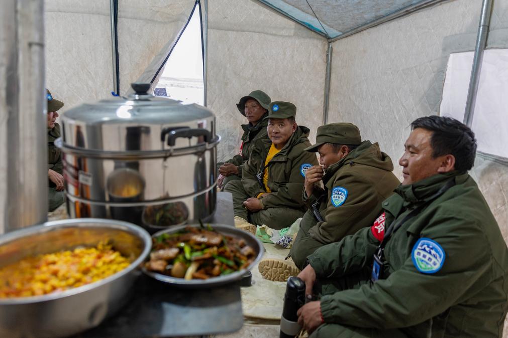 野生動物專(zhuan) 業(ye) 管護隊員們(men) 在巡護途中宿營的帳篷內(nei) 準備吃飯(5月7日攝)。新華社記者 薑帆 攝