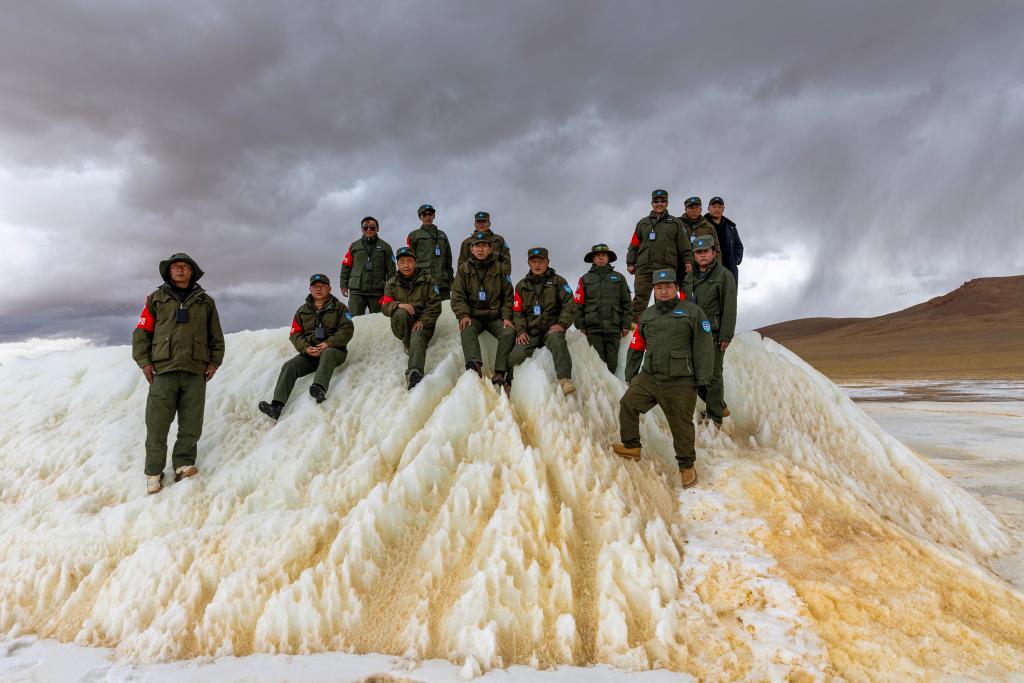 野生動物專(zhuan) 業(ye) 管護隊員在巡護路上一處埡口的冰雪堆上合影(5月7日攝)。新華社記者 薑帆 攝