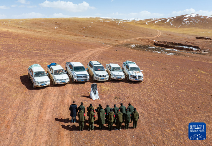 野生動物專(zhuan) 業(ye) 管護隊員們(men) 在無人區深處的羅布玉傑烈士紀念碑前默哀致敬(無人機照片,5月10日攝)。 新華社記者 薑帆 攝