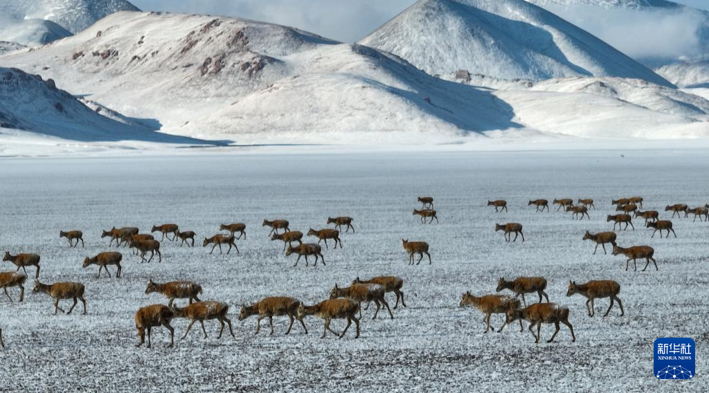 這是在甜水河畔荒灘雪地中向產(chan) 羔地遷徙的藏羚羊(6月15日攝 無人機照片)。新華社記者 晉美多吉 攝