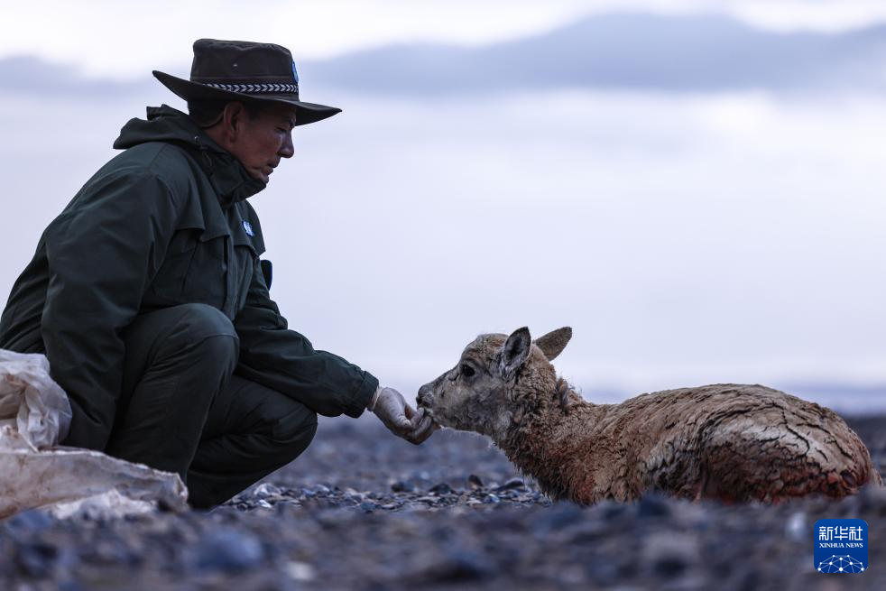 羌塘國家級自然保護區的野生動物專(zhuan) 業(ye) 管護隊員在安撫受傷(shang) 的藏羚羊(6月13日攝)。新華社發 旦增 攝