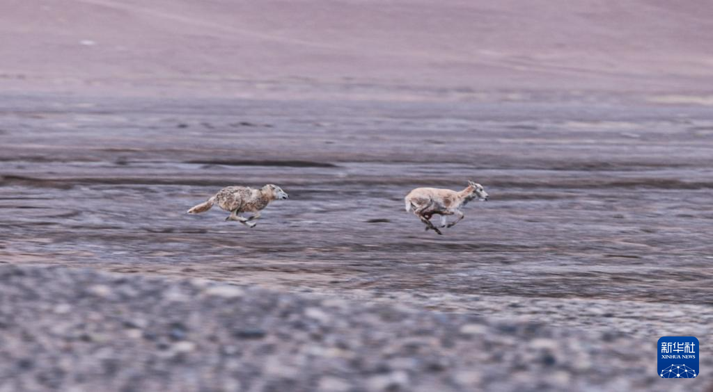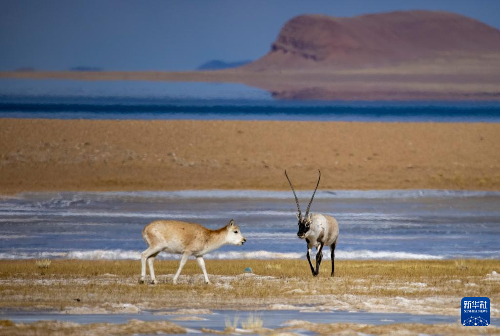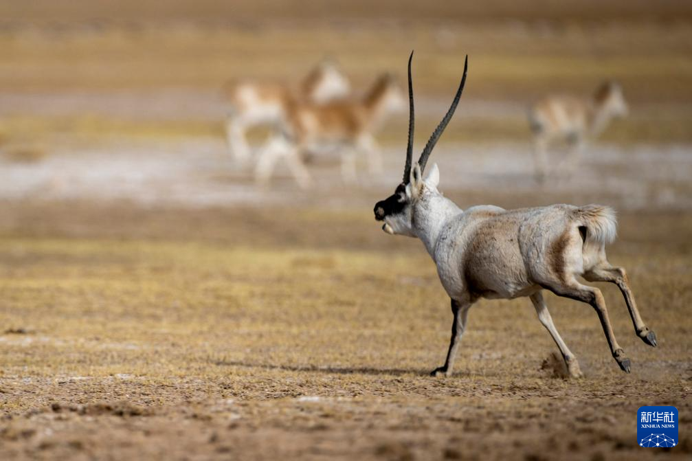 在羌塘國家級自然保護區,一隻雄性藏羚羊奔向雌性(2023年12月16日攝)。新華社記者 薑帆 攝