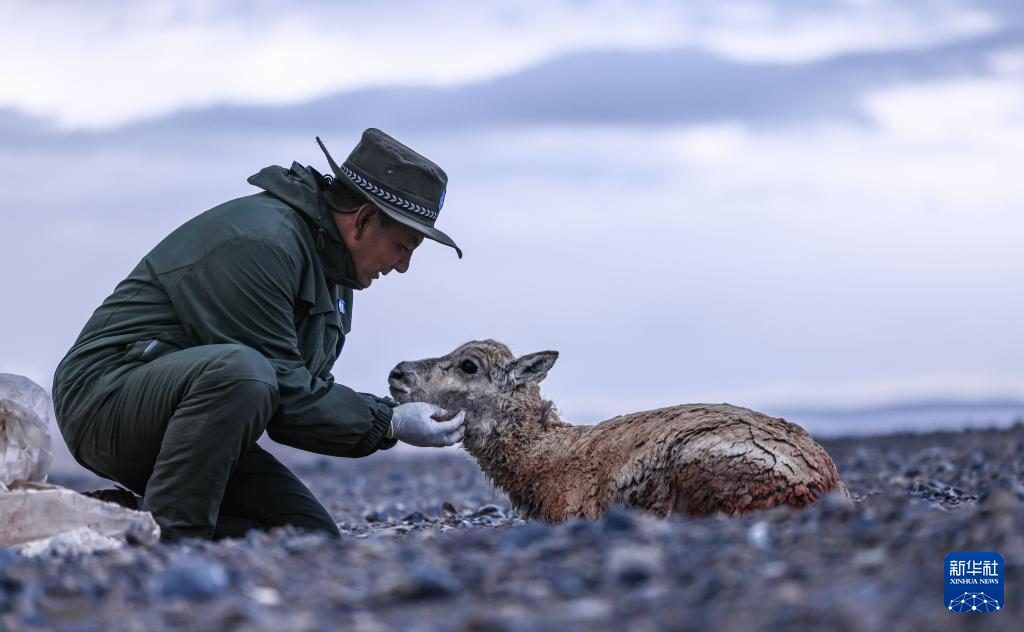 羌塘國家級自然保護區的野保員在安撫受傷(shang) 的母藏羚羊(6月14日攝)。新華社發(旦增攝)