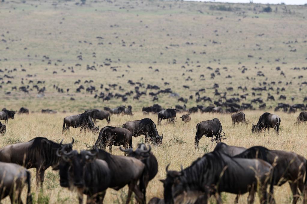 ↑ 在馬賽馬拉國家保護區,一群角馬在草原上覓食。