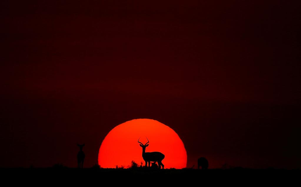 ↑ 在馬賽馬拉國家保護區,遷徙中的野生動物在夕陽下覓食。
