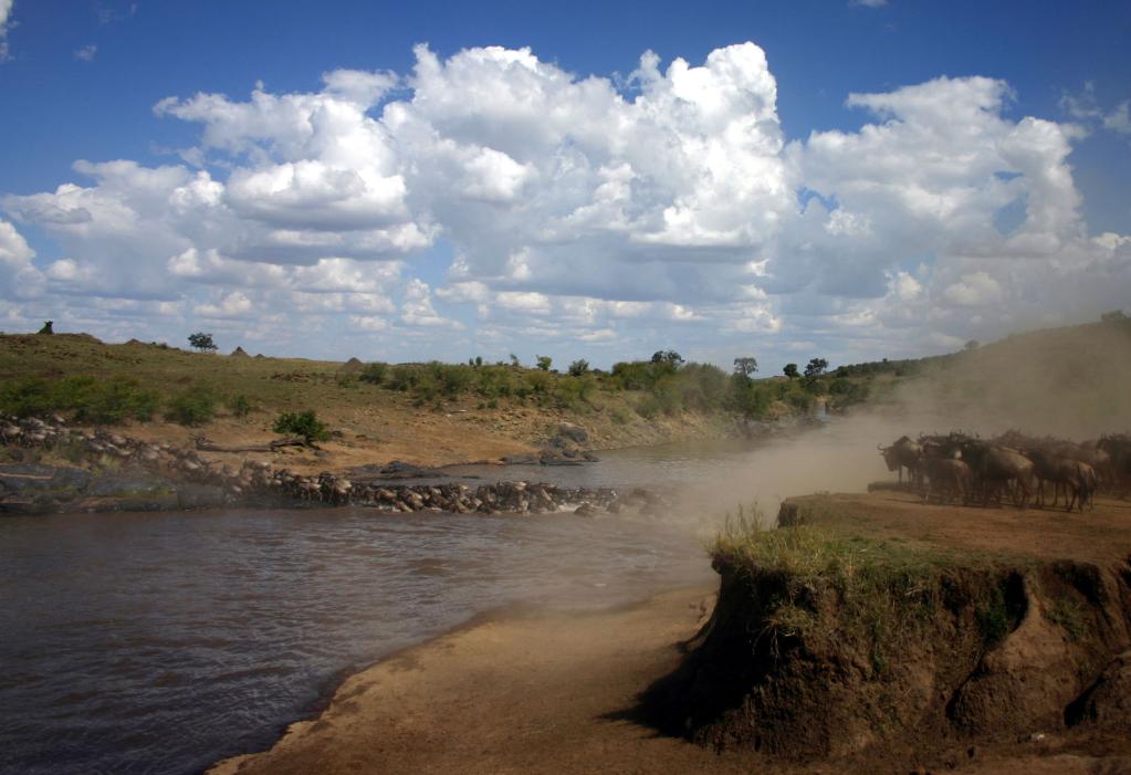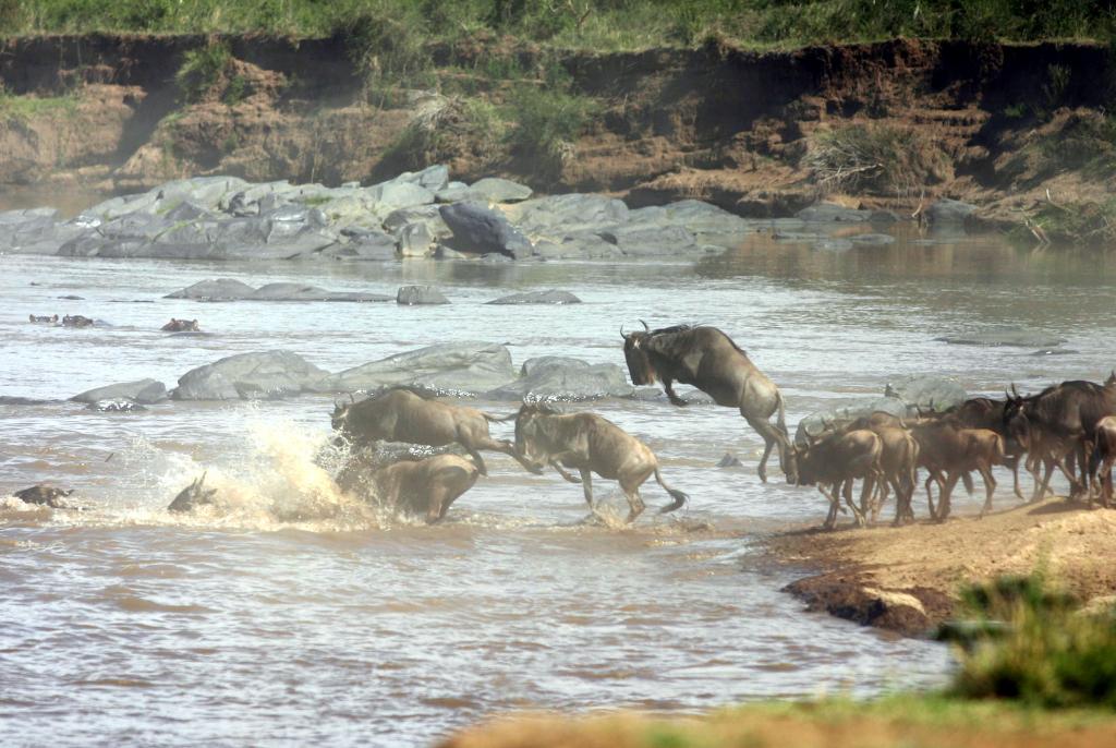 ↑ 在馬賽馬拉國家保護區,遷徙中的角馬越過馬拉河。