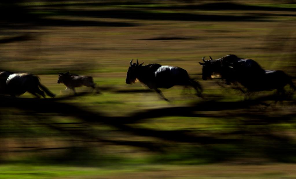 ↑ 在馬賽馬拉國家保護區,遷徙中的角馬因為(wei) 感受到某種危險而奮力奔跑。