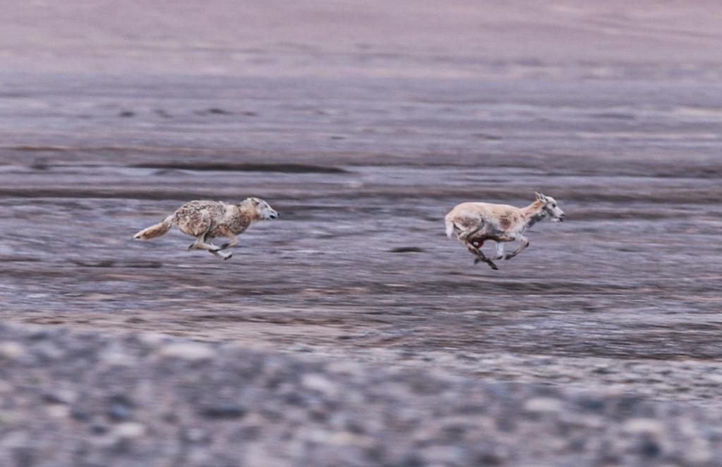 ↑ 在羌塘國家級自然保護區,一隻野狼正在捕食遷徙中的母藏羚羊。在藏羚羊的遷徙過程中,野狼、雪豹、藏馬熊和藏野狐等掠食動物守候在遷徙路上,隨時準備捕食。