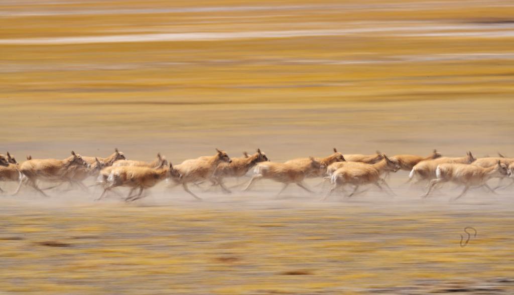 ↑ 在羌塘國家級自然保護區,遷徙中的藏羚羊因為(wei) 感受到危險而奮力奔跑。