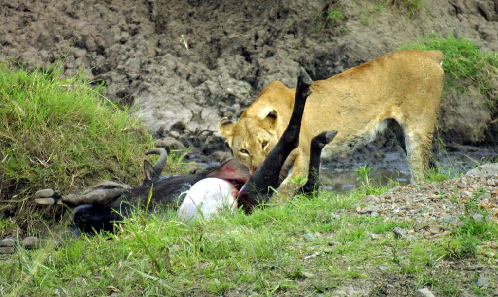 ↑ 在馬賽馬拉國家保護區,一頭獅子正在享用自己的獵物。