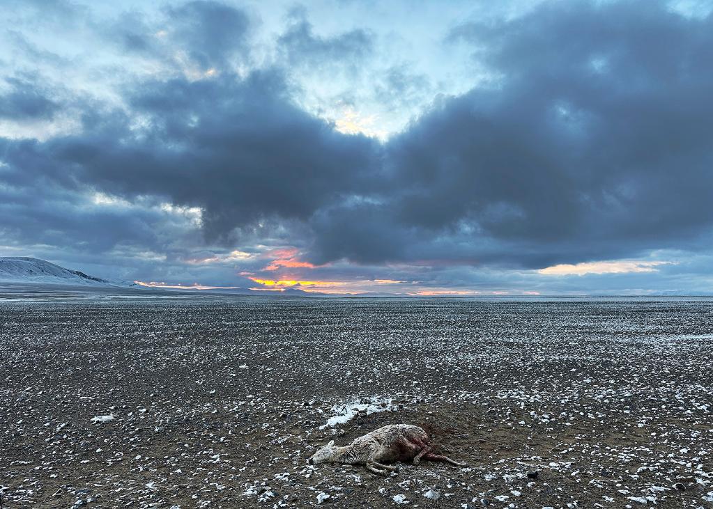 ↑ 在羌塘國家級自然保護區,一隻被野狼咬死的母藏羚羊躺在雪後的草原上。