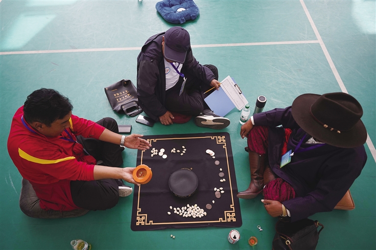 當日,“吉韌”“秀茲(zi) ”等項目一同開賽。 “吉韌”也叫藏式克郎球,是藏族的一種彈指運動。比賽在一張邊長約1米的正方形木桌球台上進行,球台四角有4個(ge) 小洞,黑、白兩(liang) 種扁圓形球子各9個(ge) ,另有1個(ge) 紅色球子放置在球台中心,1個(ge) 白色母球供雙方彈擊球子所用。