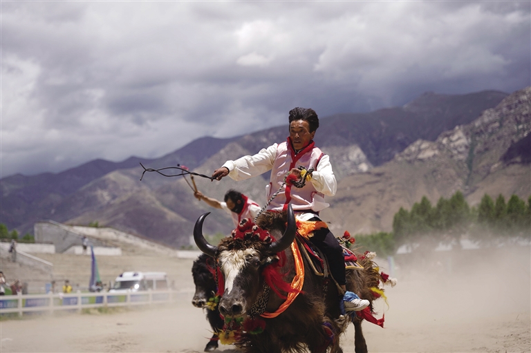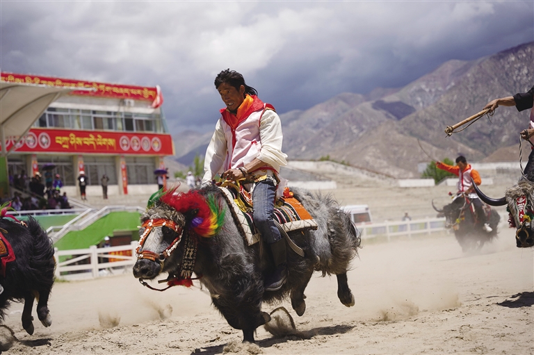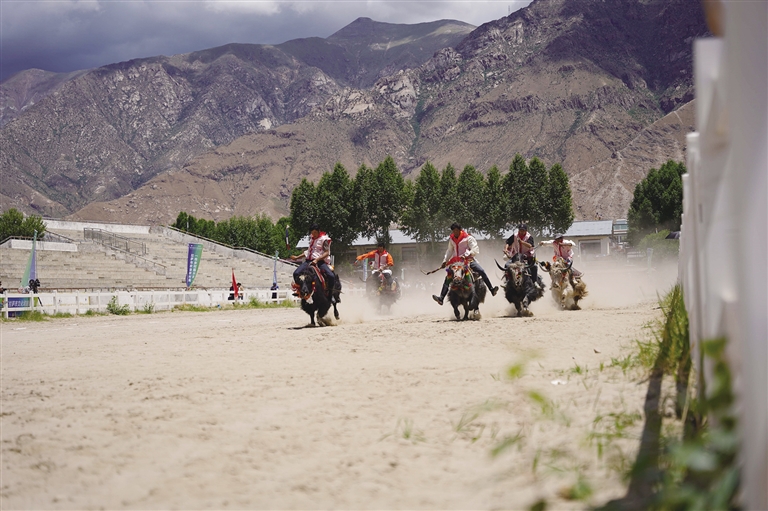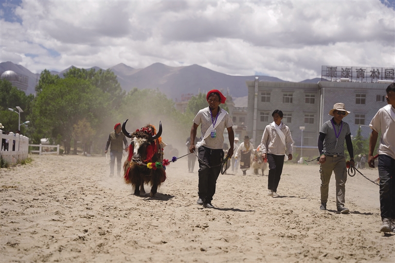 此時,賽場另一邊傳(chuan) 來歡呼,循聲望去,原來是本屆運動會(hui) 的賽犛牛正在進行。雖然犛牛生性溫和,但讓它們(men) 聽命令奔跑,也並不容易。記者了解到,參加本屆運動會(hui) 的犛牛均由主人精挑細選,主人一聲吹哨,輕微地蹬腳,犛牛就會(hui) 按指令向前行進,顯得默契十足。但偶爾也會(hui) 發生小狀況,比如犛牛分不清方向擠成一團,跑著跑著就停頓休息,或者原路返回等,引得觀眾(zhong) 頻頻發笑。