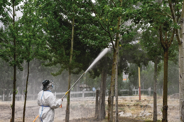 病因找到了,如何對症下藥才是關(guan) 鍵。防治隊將整片楊樹林分成三個(ge) 區域,首先伐掉幹死腐爛的樹,其次對病害區域進行殺菌消毒。“每個(ge) 區域我們(men) 噴灑的藥劑也不同,主要是想對防治效果進行實驗。通過持續兩(liang) 個(ge) 月的觀察,發現第一組藥劑防治效果明顯,因此我們(men) 開始在整片楊樹林推廣第一組藥劑。”黃敏說。