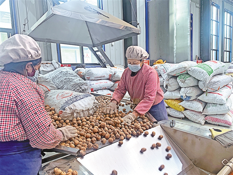 圖為(wei) 工人們(men) 在挑選野生山核桃油的原料—核桃。