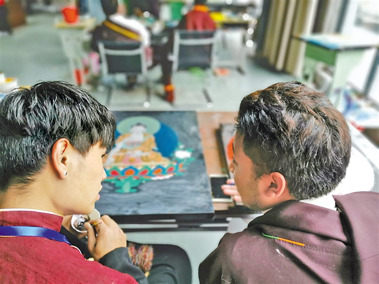 圖為(wei) 唐卡畫師在交流唐卡漆畫創作技巧。