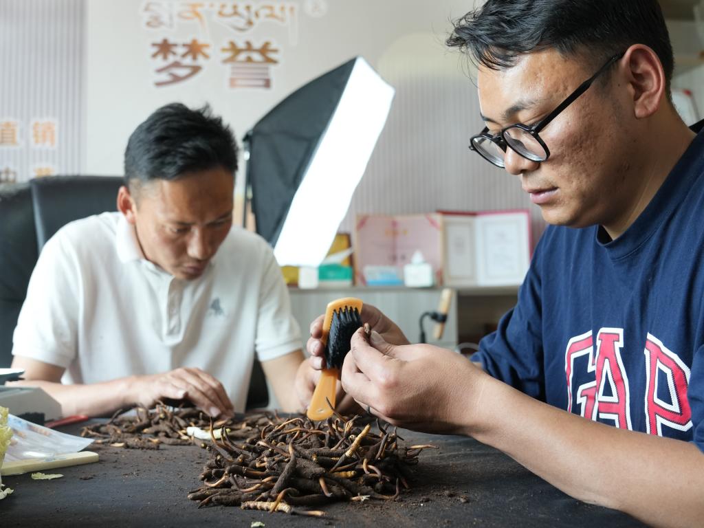 羅拉(右)在公司內(nei) 清潔新鮮蟲草(5月31日攝)。新華社記者丁汀 攝