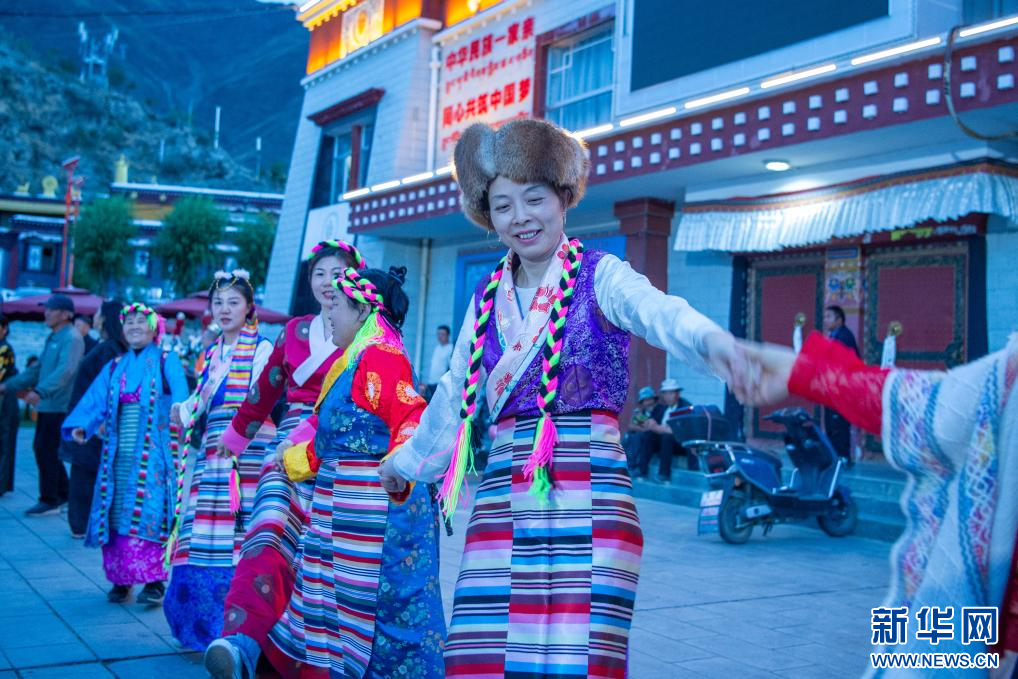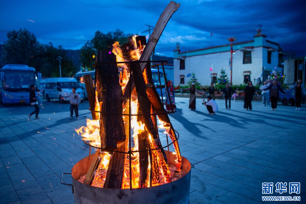 6月24日,遊客在紮西曲登社區廣場體(ti) 驗篝火廣場舞。新華網 旦增努布 攝