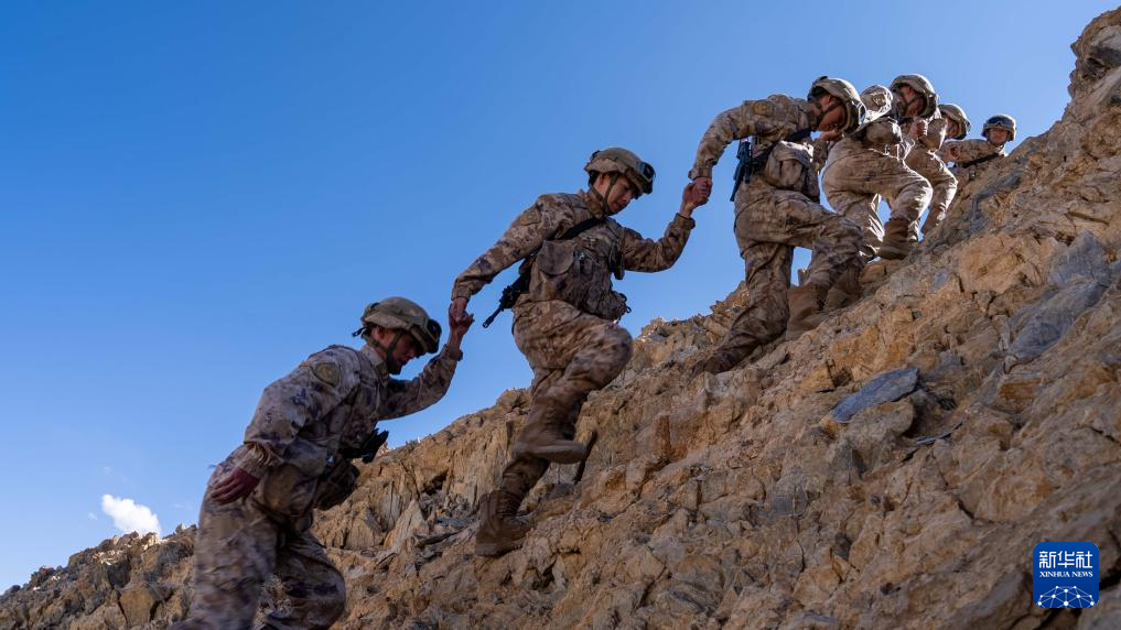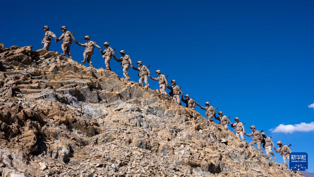 西藏阿裏軍(jun) 分區普爾楚邊防連秋迪儉(jian) 革拉哨所巡邏官兵在巡邏途中爬越陡峭山坡(6月29日攝)。新華社發(戴學武 攝)