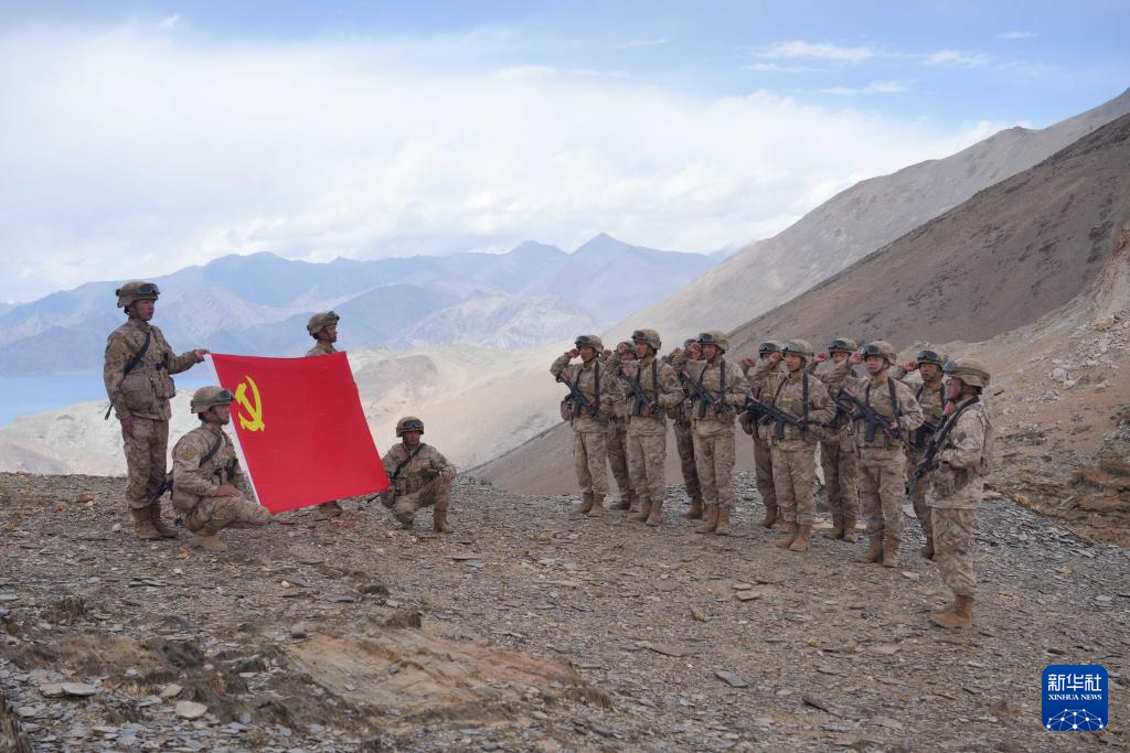 西藏阿裏軍(jun) 分區普爾楚邊防連秋迪儉(jian) 革拉哨所巡邏官兵在海拔5700米的巡邏點位組織重溫入黨(dang) 誓詞活動(6月29日攝)。新華社發(戴學武 攝)