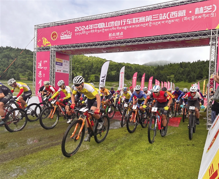 6月29日,2024年中國山地自行車聯賽第三站(西藏·林芝)在林芝市比日山國家森林公園天邊牧場開賽。來自全國各省、自治區、市的16支專(zhuan) 業(ye) 代表隊,以及業(ye) 餘(yu) 選手、自行車愛好者們(men) 一同角逐競技。