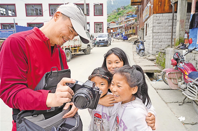 圖為(wei) 日喀則市文聯采風團成員在陳塘鎮向小朋友展示采風照片。