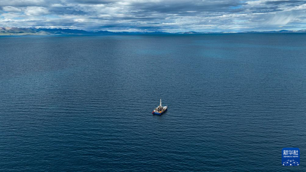 7月11日拍攝的納木錯水上鑽探平台(無人機照片)。新華社記者 晉美多吉 攝
