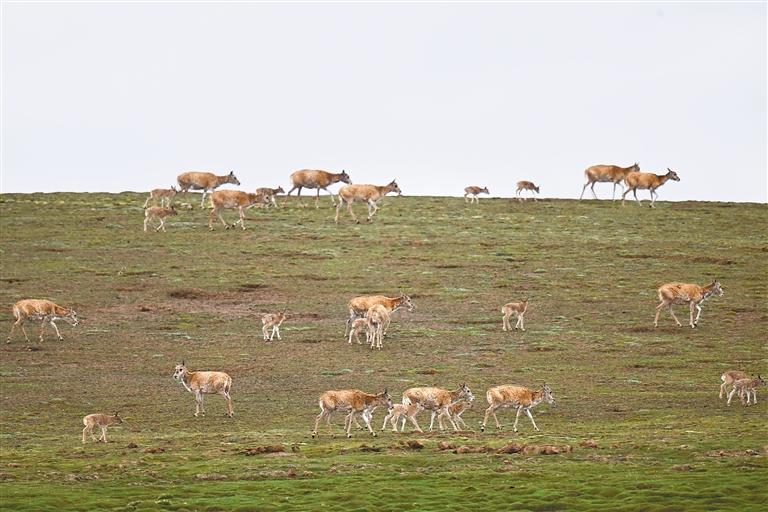卓乃湖位於(yu) 世界自然遺產(chan) 地可可西裏腹地。今年5月以來,來自青海三江源、新疆阿爾金山、西藏羌塘等地的雌性藏羚羊陸續遷徙至卓乃湖區域產(chan) 仔。7月下旬開始,產(chan) 仔結束後的雌性藏羚羊將再攜幼仔返回原棲息地。