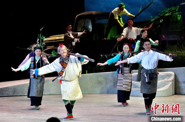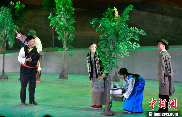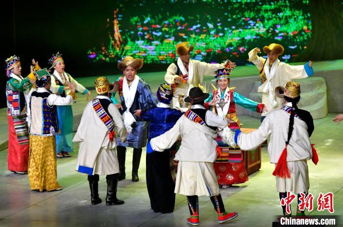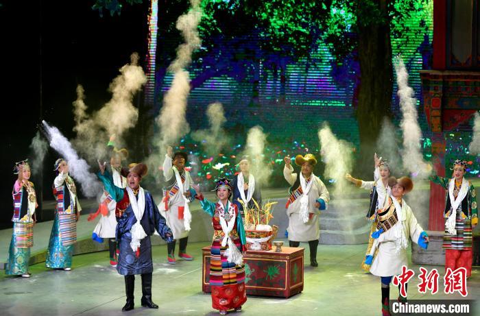 7月13日晚,由西藏自治區藏劇團打造的新編現實題材藏戲《綠色哈達》在拉薩開演。該劇將傳(chuan) 統藏戲元素與(yu) 現代舞台表現手法相結合,展現了西藏通過實施“一江兩(liang) 河”等工程形成的高原生態治理成效。圖為(wei) 演出現場。中新社記者 李林 攝