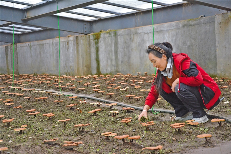 圖為(wei) 珞瓦新村村民在大棚裏檢查靈芝的長勢。記者 汪純 丹增平措 武沛濤 攝