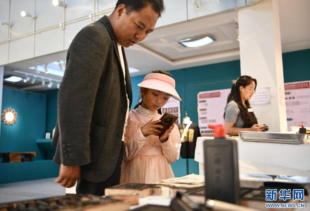 7月19日,一名小朋友在家長陪同下拍攝感興(xing) 趣的西藏雕版印刷品。