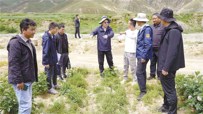 南木林縣數字農(nong) 業(ye) 產(chan) 業(ye) 園內(nei) ,山東(dong) 省第八批援藏幹部調研“艾瑪”土豆種薯擴繁發展情況。
