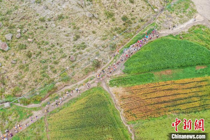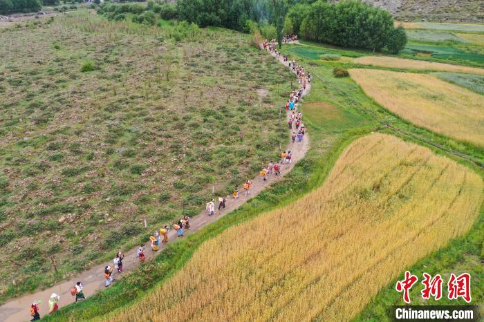 7月24日,西藏拉薩市曲水縣南木村迎來了一年一度的“望果節”。當日,村民們(men) 盛裝打扮背上經文,圍繞全村田園轉上一圈,轉到每一塊農(nong) 田前都要煨桑祈求風調雨順、五穀豐(feng) 登。“望果節”民俗已有1500多年的曆史,是國家級非物質文化遺產(chan) 。圖為(wei) 曲水縣南木村村民身著盛裝背上經文繞田。(無人機照片)中新社記者 貢嘎來鬆 攝