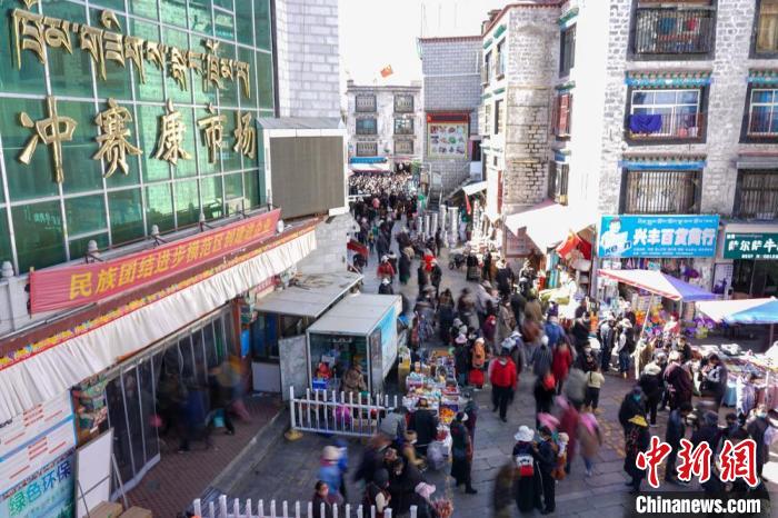 資料圖為(wei) 拉薩衝(chong) 賽康市場周邊人流、商戶雲(yun) 集,該市場是西藏最大的傳(chuan) 統百貨市場之一。